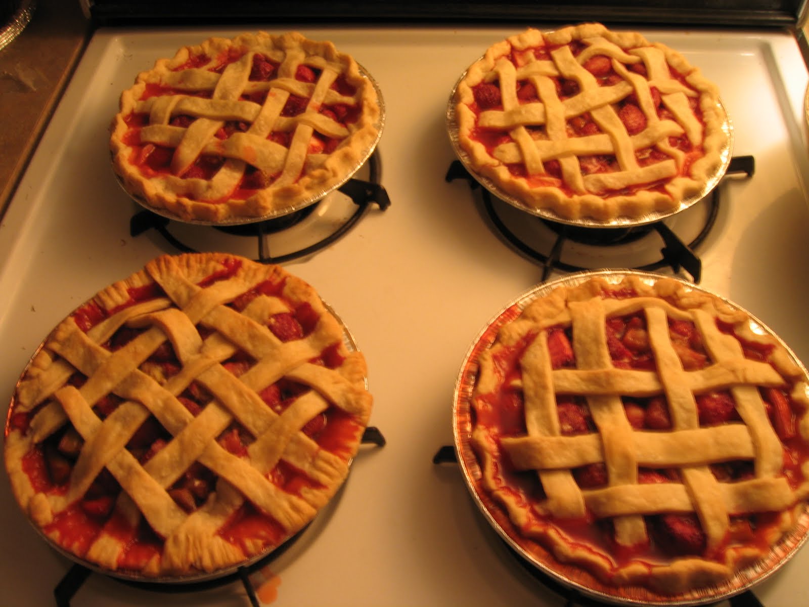 Got together with Edie this weekend to dispatch of some Rhubarb in her freezer, and to take advantage of the new crop of Ontario Strawberries. Three hours and a bit of sweat and blood, and we ended up with four beautiful pies.
